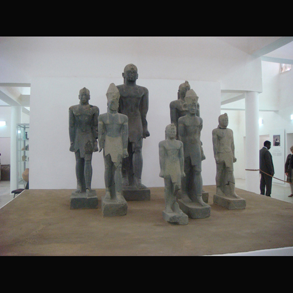 The museum’s exhibition gallery covers a surface of approximately 500 square metres. A corridor opens onto a wide central hall that in turn gives way to a series of smaller rooms. The central hall comprises columns and a 70 cm high podium, where are displayed the statues of the black pharaohs. A white wall serves as backdrop in order to highlight them.