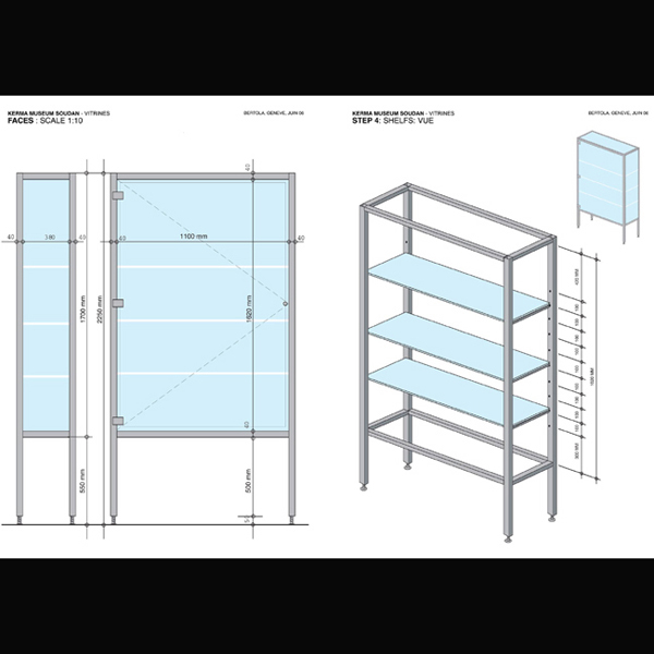 The museum includes forty cases, designed in Switzerland and created in Khartoum during 2006 by a small specialized firm. They measure 220 cm in height by 170 cm in width, their depth either 30 cm or 60 cm depending on the size of objects displayed. At the end of 2006, the cases were sent in pieces to the Kerma Museum together with technicians who would assemble them. During 2007-2008, these were installed in the galleries and the archaeological objects placed within them. This incredibly rich collection of artefacts is entirely dedicated to the prehistory and history of the Kerma region. With it, it is possible to illustrate the human evolution of Sudan’s Northern Province over hundreds of thousands of years.